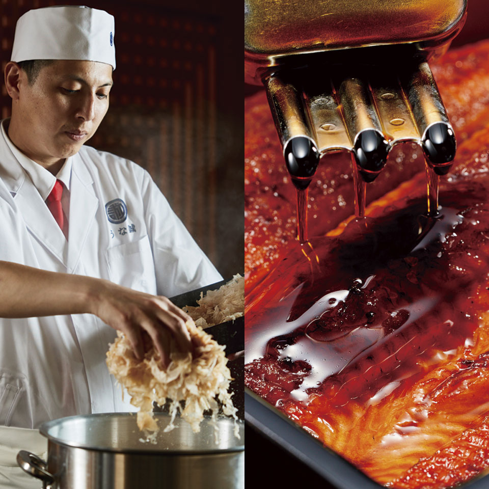 伝統的な調理法である「蒸し焼き」によって、ふっくらとした柔らかい食感と豊かな風味を実現。 こだわり抜いた特製のタレと出汁でさらに美味しさを引き立てています。うな重だけでなく、御膳料理やひつまぶし、うまきや柳川など様々なアラカルトメニューも取り揃えており、うなぎを多彩に楽しんでいただける工夫が随所に施されています。