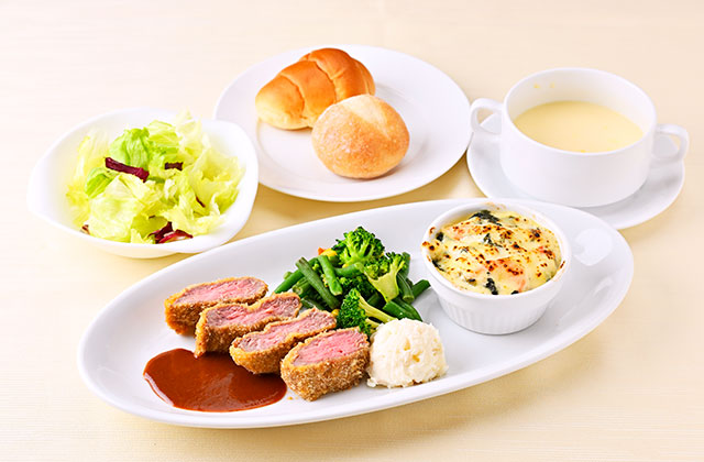 〇ビーフカツレツ デミグラスソース & 海老とペンネ・ほうれん草のココットグラタン