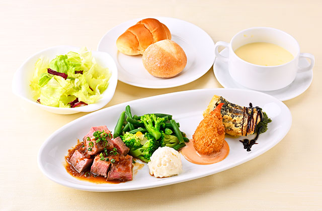 〇サイコロステーキ 和風おろしソース&オマールクロケット・季節魚のセモリナフリット